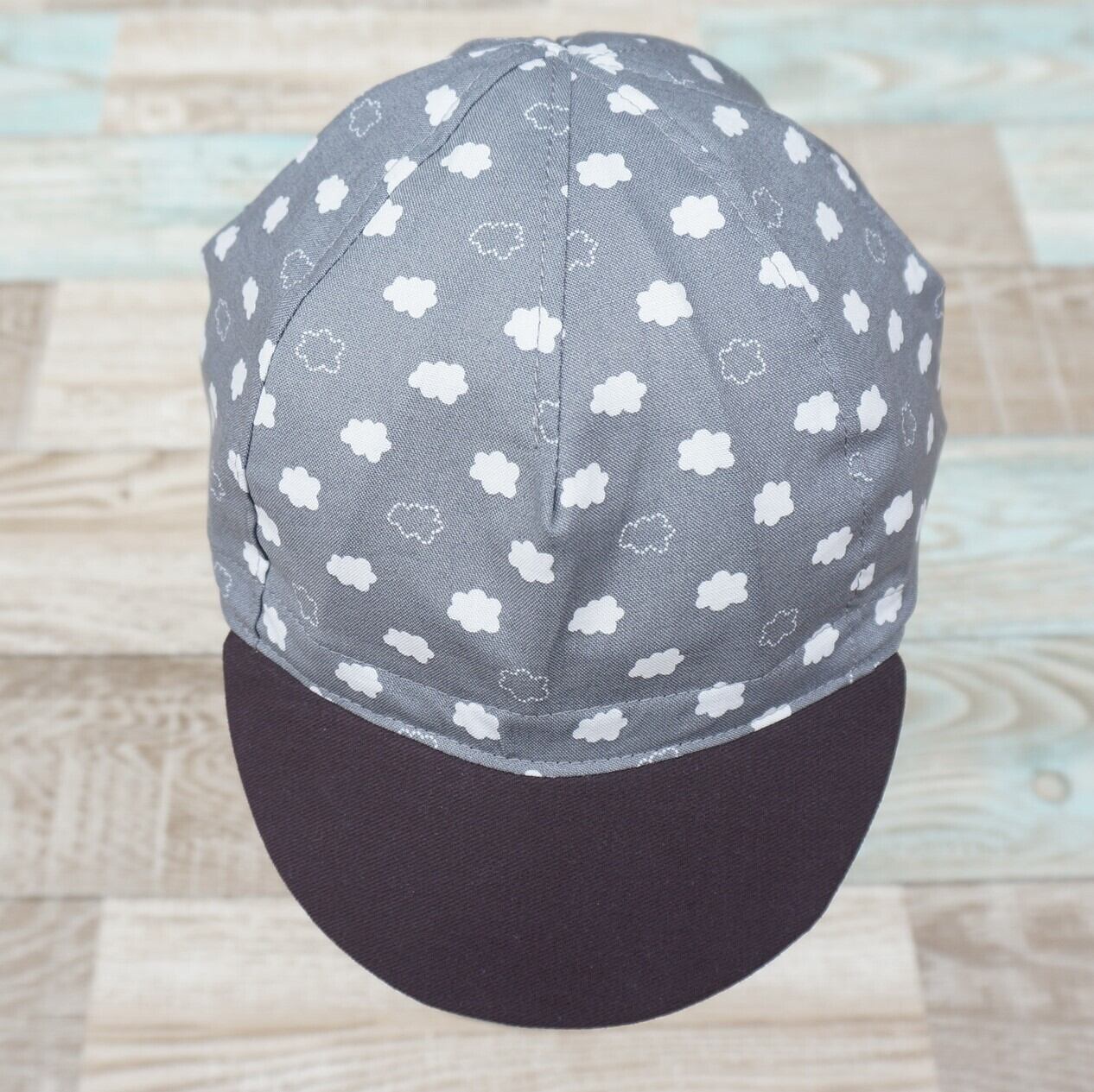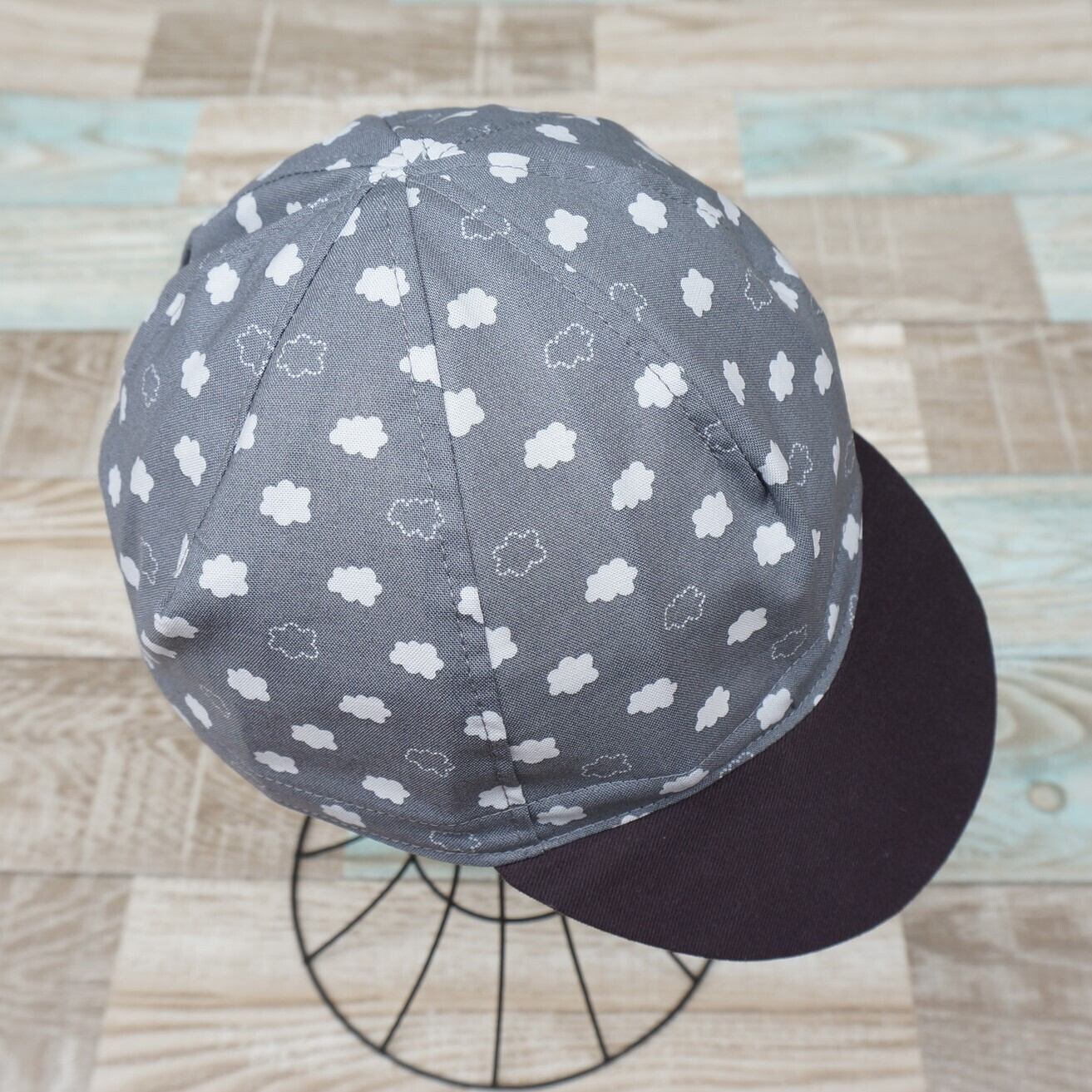グレーの背景に雲の絵が沢山描かれている可愛らしいキャップ。