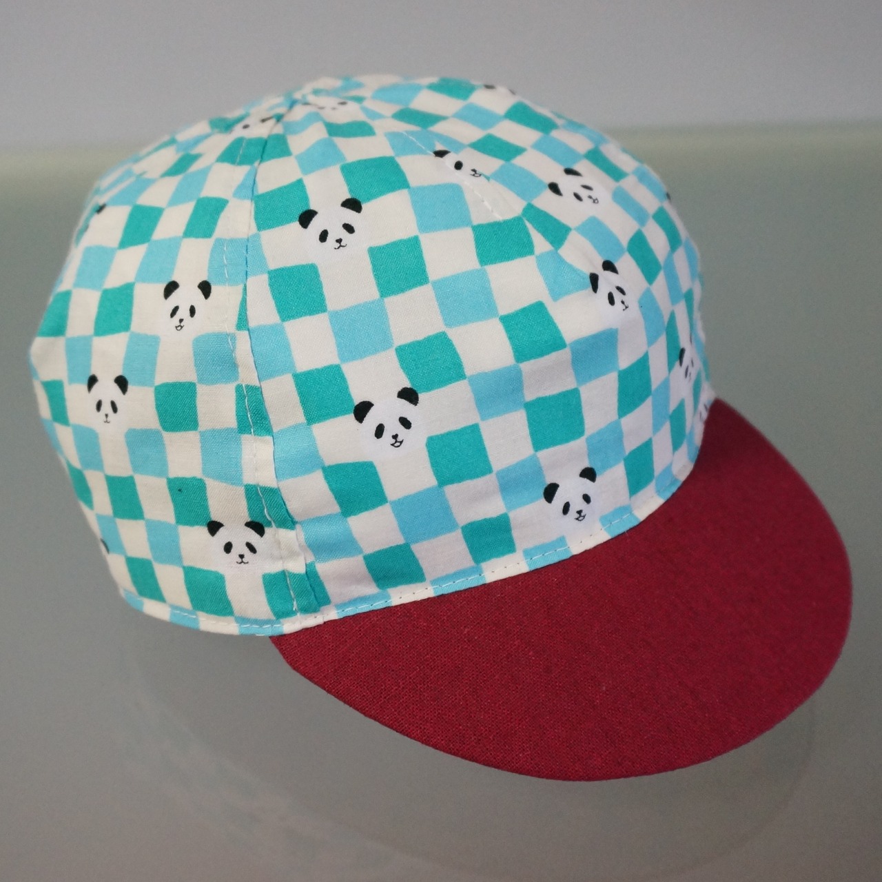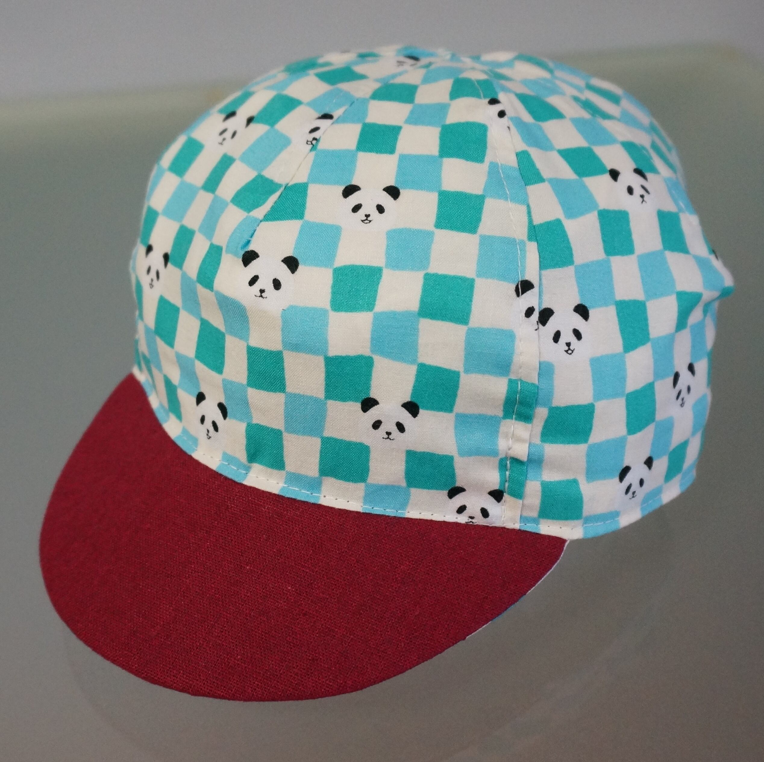 涼しげな水色ベースの市松模様に渋めの赤いツバ生地を合わせてみました。